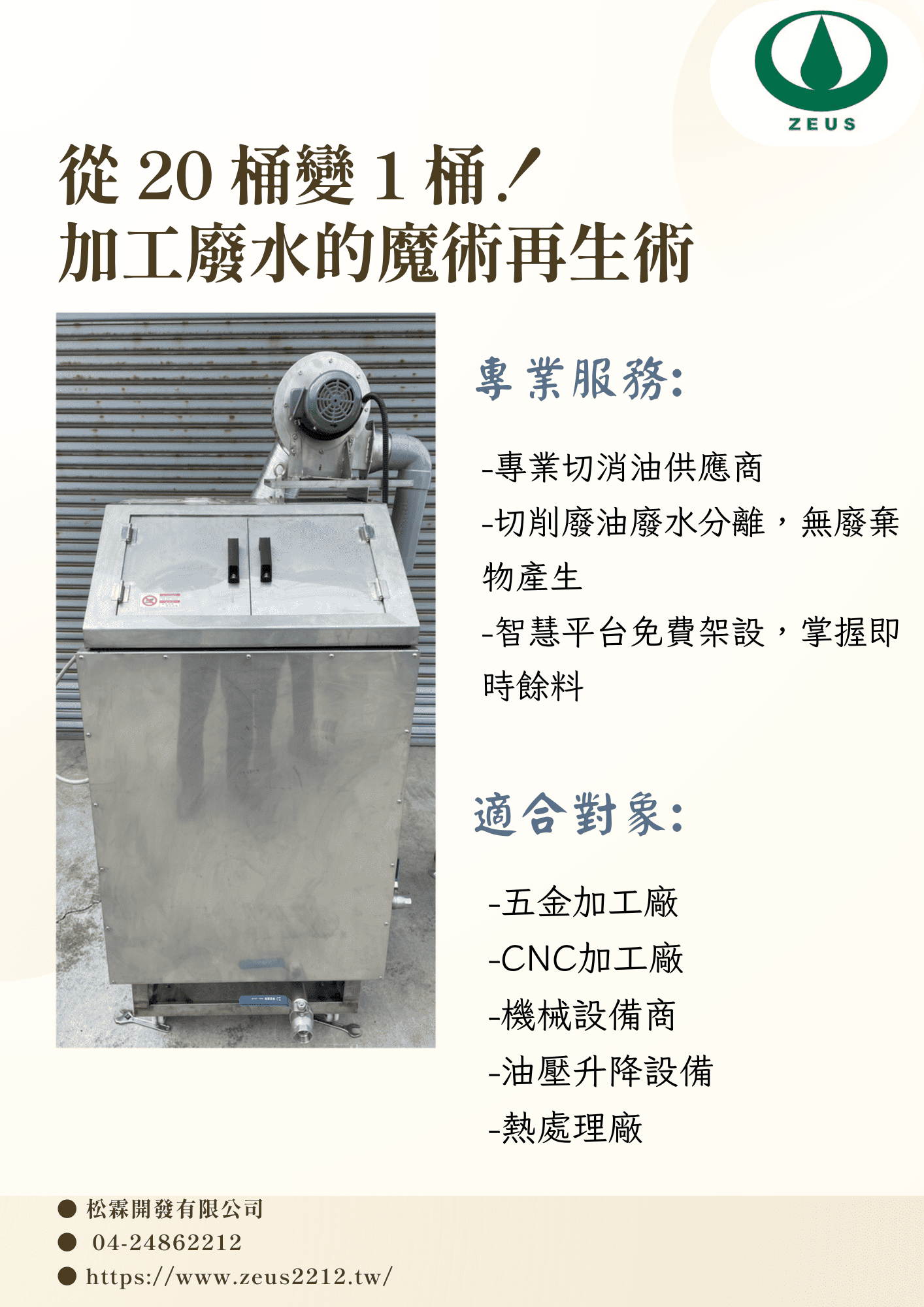 在工業生產製程中,切削液與含油廢水一直是企業沉重負擔,不但處理費用高昂,也造成環境風險。